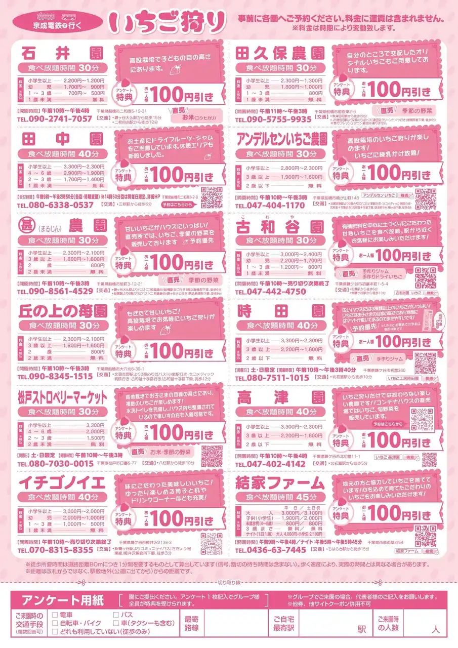 各駅のラックに設置してあるチラシのアンケートにご記入いただき、入園の際、各農園にお持ちいただくと通常の料金から100円引きになります。 |