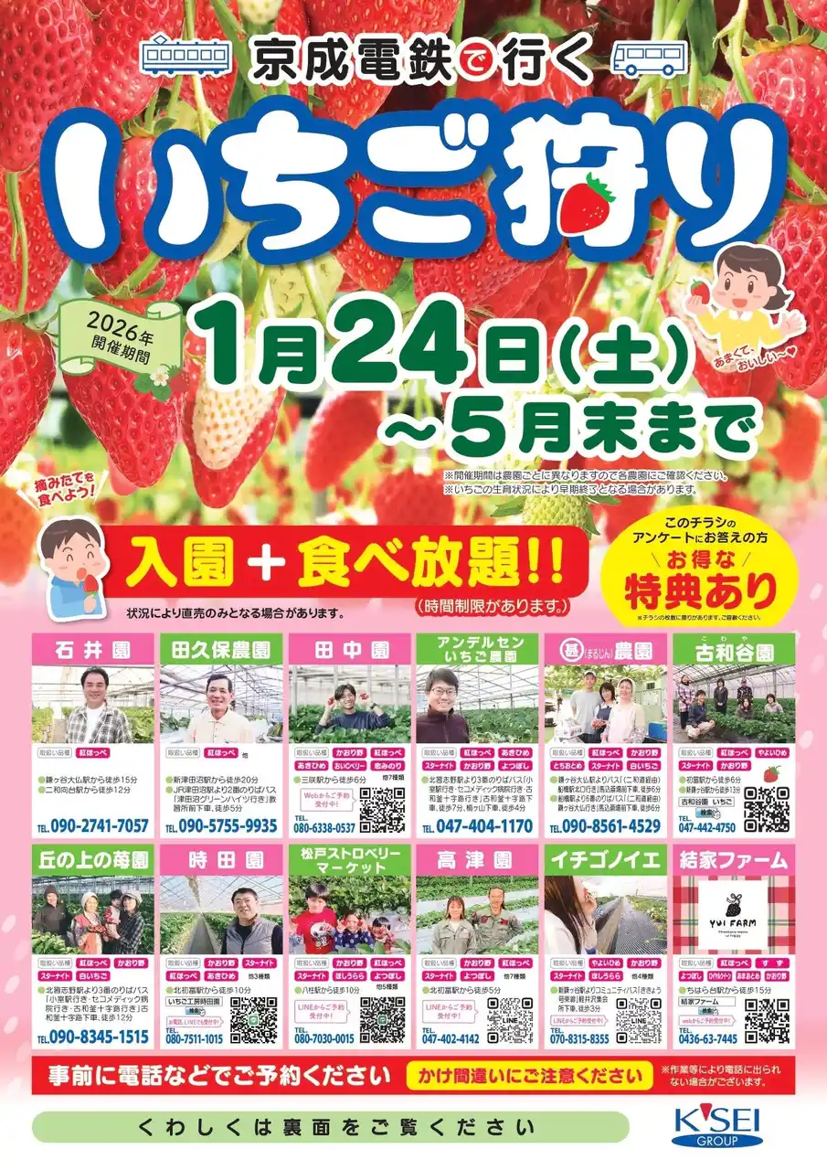京成電鉄(本社:千葉県市川市、社長:天野 貴夫)では、2026年1月24日(土)から沿線12農園と連携した「京成電鉄で行く いちご狩り」を開催いたします。本企画は、各駅に設置してあるチラシのアンケートにご記入いただき、入園の際、各農園にお持ちいただくと通常の料金から100円引きで、いちご狩りがお楽しみいただけるものです。 |