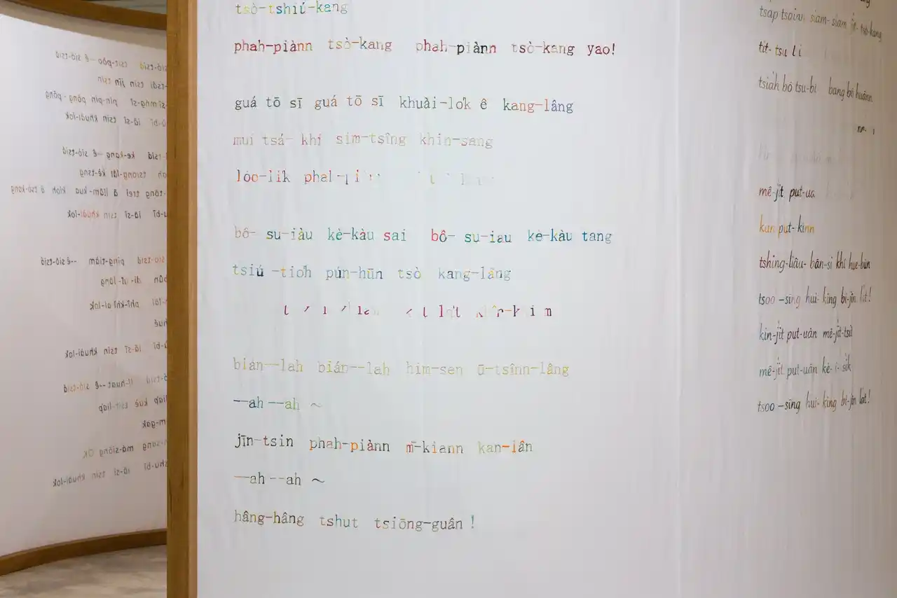 ・侯怡亭(ホウ・イーティン)《所有的小姐 Soo-ū -e sio-tsia》では、日本文化の影響を受けた台湾語の歌詞を刺繍として表現し、言語の背景にある歴史や社会の記憶を浮かび上がらせる。 |