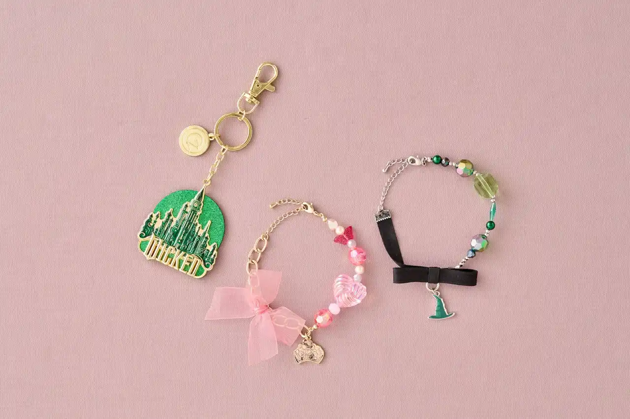 また、映画の世界観をイメージした、身につけて楽しめるオリジナルグッズも登場。エルファバとグリンダの魅力を落とし込んだ、パークでも日常でも楽しめるアイテムです。 グラデーションカラーにラメプリントを施したスウェットや、エメラルドシティを表現した刺繍とプリントが映えるジャケットをはじめ、バッグにつけて楽しめるキーチェーンや、帽子モチーフとシフォンリボンがアクセントのブレスレットセットなど、さりげなく世界観を取り入れられるアイテムを豊富にご用意しています。 |