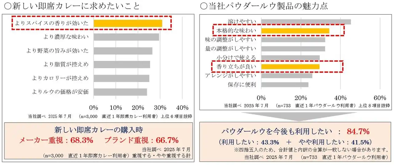 新しい即席カレーに対しては、スパイスの香りが効いた味わいを求める方が最も多く、その購入の決め手としてメーカーやブランドが重視されています。 |
