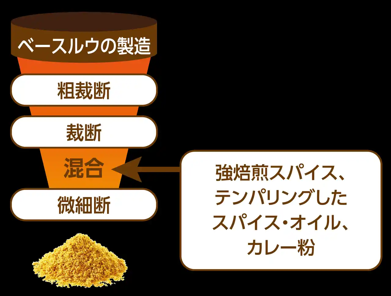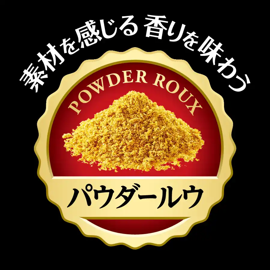 熱をかけるとおいしくなる素材でベースのルウを製造し、それを粗く裁断。その後、熱をかけない方がおいしい素材を加えながら、細かく裁断しパウダーにします。固形のルウに比べ、油脂や小麦粉の使用が控えめであるため、 |