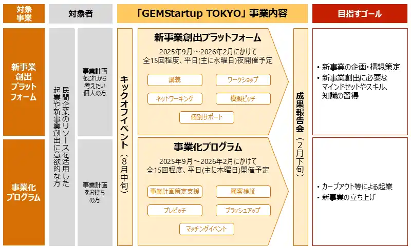 本事業(GEMStartup TOKYO)は、大企業等の民間企業に眠る優れたアイデア、人材や技術シーズを発掘することを目的とした、東京都による新事業創出プロジェクトです。 |