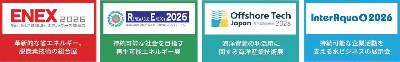 ENEX展示会事務局(株式会社JTBコミュニケーションデザイン、以下JCD)は、2026年1月28日(水)から1月30日(金)まで、「ENEX 2026第50回地球環境とエネルギーの調和展(同時開催:第20回再生可能エネルギー世界展示会&フォーラム、Offshore Tech Japan2026第7回海洋産業技術展、InterAqua 2026第17回水ソリューション総合展)」を東京ビッグサイトで開催します。 |