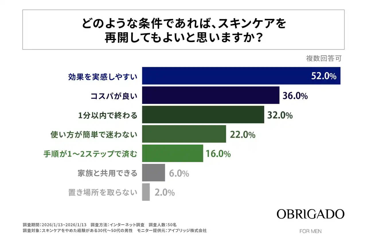 さらに、再開条件としては「効果を実感しやすい(52%)」「コスパが良い(36%)」「1分以内で終わる(32%)」が上位に挙がり、「手間をかけずに、きちんと効果を感じたい」というニーズが非常に強いことが分かりました。 |