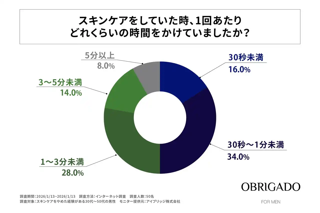 近年、男性のスキンケア市場は拡大傾向にありますが、実際には「始めたものの続かない」という声も多く聞かれます。特に30~50代の働く男性は、仕事や家庭で忙しく、自分自身のケアに十分な時間を割くことが難しい世代です。そこでOBRIGADO(オブリガード)では、男性がスキンケアを継続できない理由と、継続に必要な条件を明らかにすることを目的に、「男性のスキンケア離脱調査」を実施しました。 |