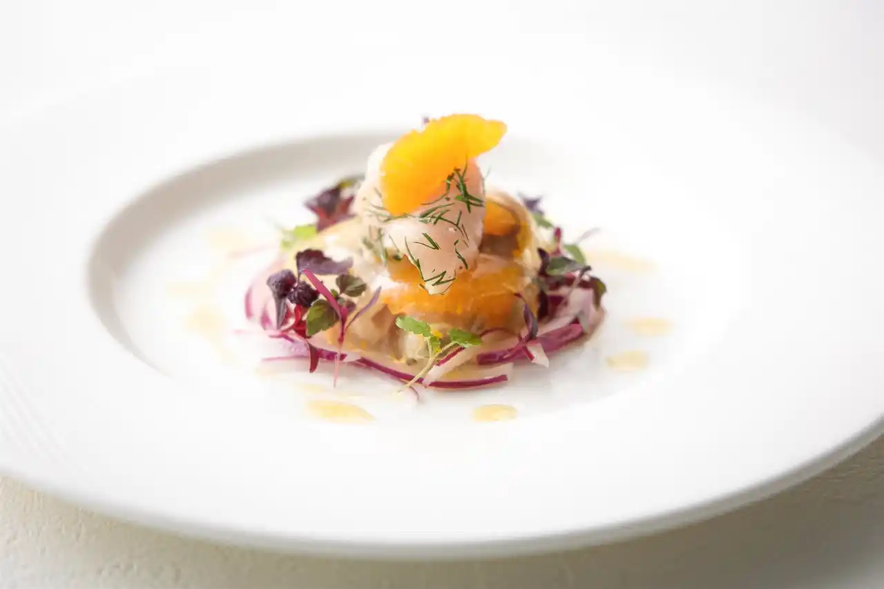 | フェアでは、イタリア各地の郷土料理にオリジナルのアイデアや技法をプラス。“鰤のカルパッチョ リグーリア州のオリーブオイルと柑橘”は、新鮮な鰤のスライスをオレンジの実や皮も入れた爽やかな柑橘ソースでマリネし、北イタリアに位置するリグーリア州の薫り高きオリーブオイルをたっぷりとかけて仕上げます。 | |||
