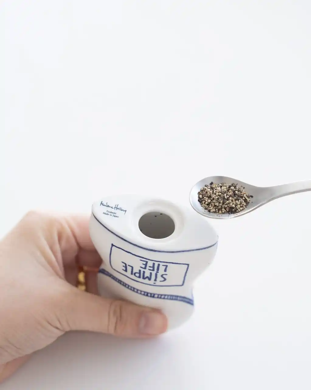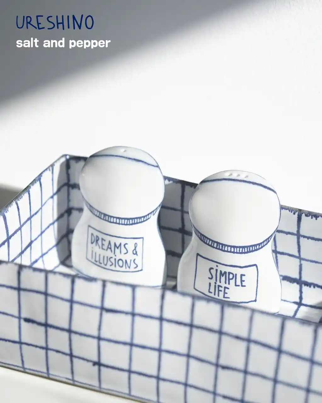 マリアンヌのジャパンシリーズより、嬉野肥前吉田焼の窯元で制作されたソルト&ペッパー。一つ穴の塩入れには「DREAMS & iLLUSiONS」、三つ穴の胡椒入れには「SiMPLE LiFE」。それぞれに、マリアンヌの言葉が刻まれています。底の栓を外して、塩や胡椒を補充することができます。 |