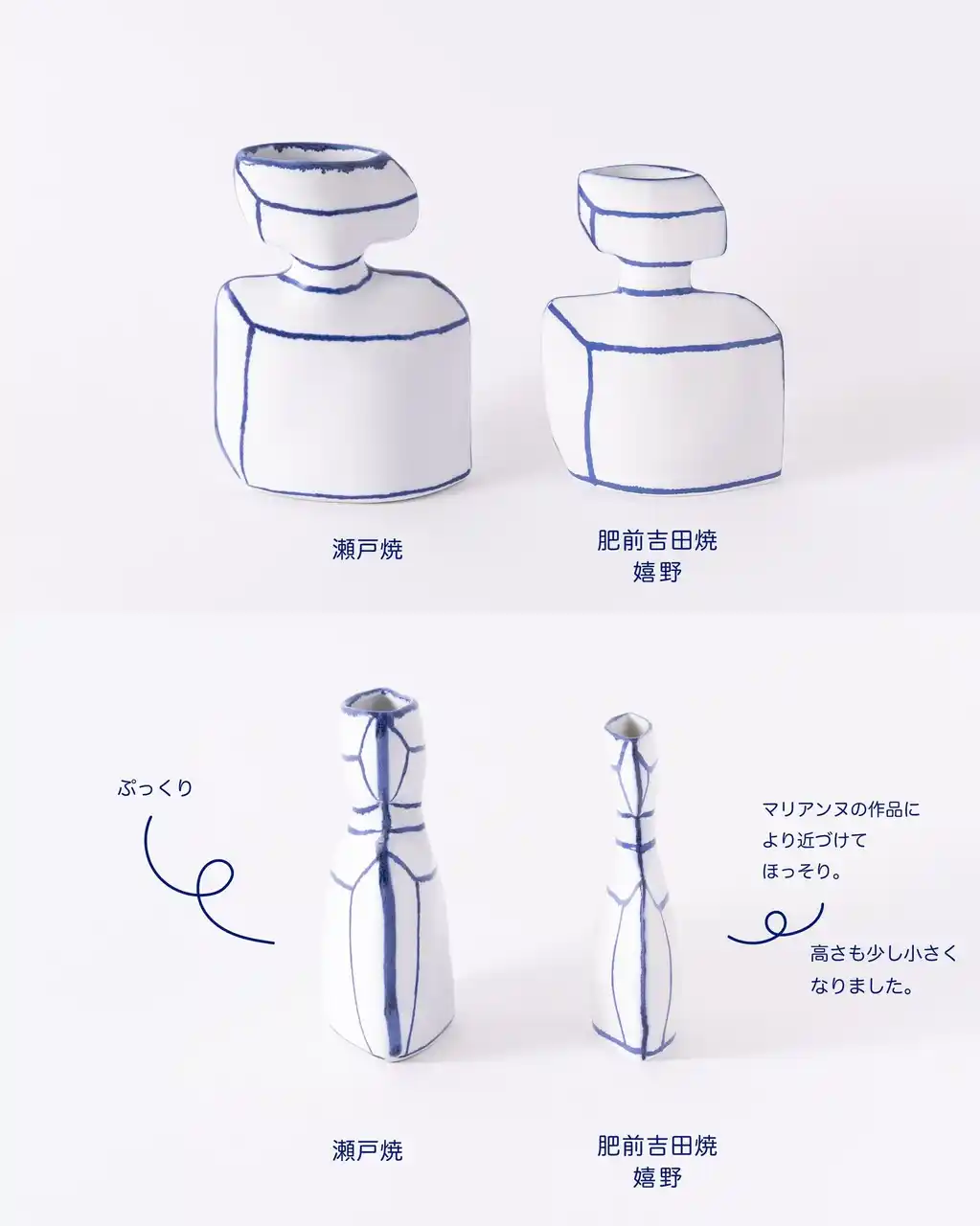 マリアンヌの原型は、日本の職人さんの元に届けられ、彼らの手により日本的な技巧と洒脱が加わることで、にっぽんのマリアンヌが完成します。今回の窯元さんの拠点は佐賀県嬉野市。我々マリアンヌチームは「うれしの」の地名に過敏に反応せずにはいられません。ここに、「日本のうれしいマリアンヌ」の始まりを高らかに宣言いたします!(特集サイトより) |