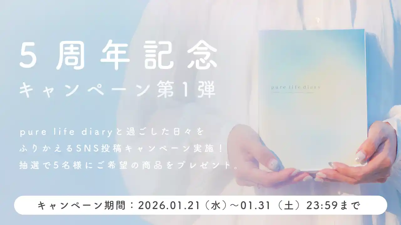 『pure life diary』誕生5周年を記念したSNSキャンペーンを実施いたします。 「pure life diaryを使ってよかったこと」をテーマに投稿してくださった方の中から、抽選で5名様にプレゼントをお届けします。 |
