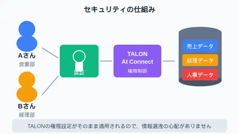 2.安全なアクセス制御 TALONの認証基盤と連携し、利用者のアクセス権限に基づいて情報を制御。権限を持っていないデータにはアクセスできません。 |