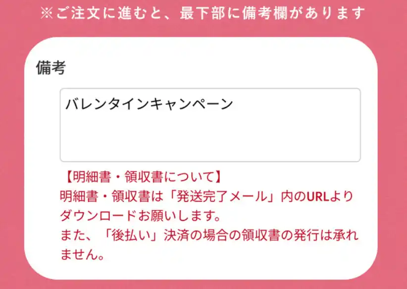 | 2.ご注文の備考欄に「バレンタインキャンペーン」と記入 | |||||||||