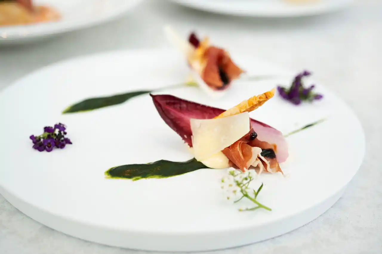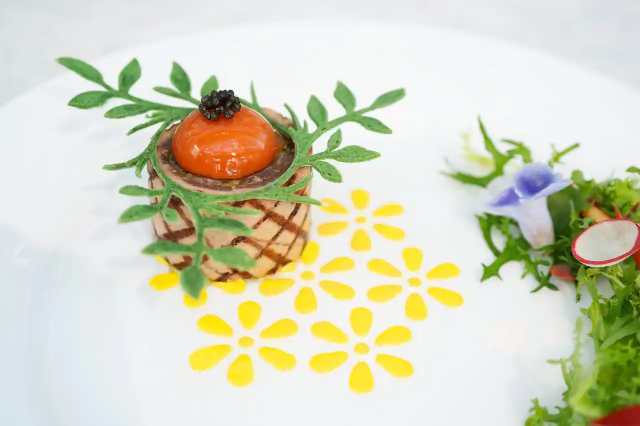 コースの幕開けを飾る前菜は、豊かな彩りの食材が調和し始まりへの期待を高めます。 |