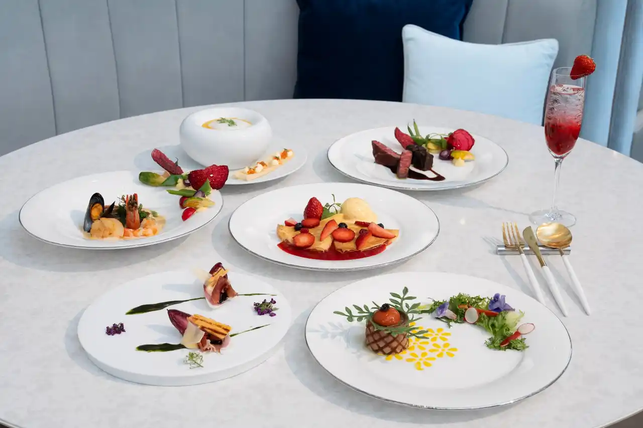 クラシカルな舞台をテーマに、前菜からデザートまでを一つの物語として構成。コースの締めくくりには、トッピングやソースに10粒のいちごを使用した「クレープシュゼット」が華やかなフィナーレを飾ります。摘みたてのようないちごの香りに包まれながら、五感で味わう特別なランチタイムをお楽しみいただけます。 |