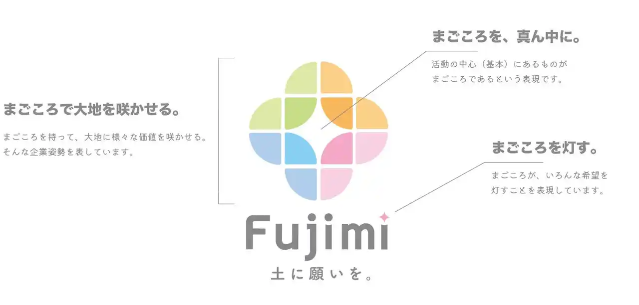私たち富士見工業は「丁寧な対応で、オーガニックな商品・サービスが欲しい顧客に、まごころこめて、本来の人と物の価値を活かす企業」であることをブランド・アイデンティティとして掲げています。この企業姿勢をビジュアルとして結晶化させたのが新しいロゴであり、その想いを一言に凝縮した言葉が「土に願いを。」です。 |
