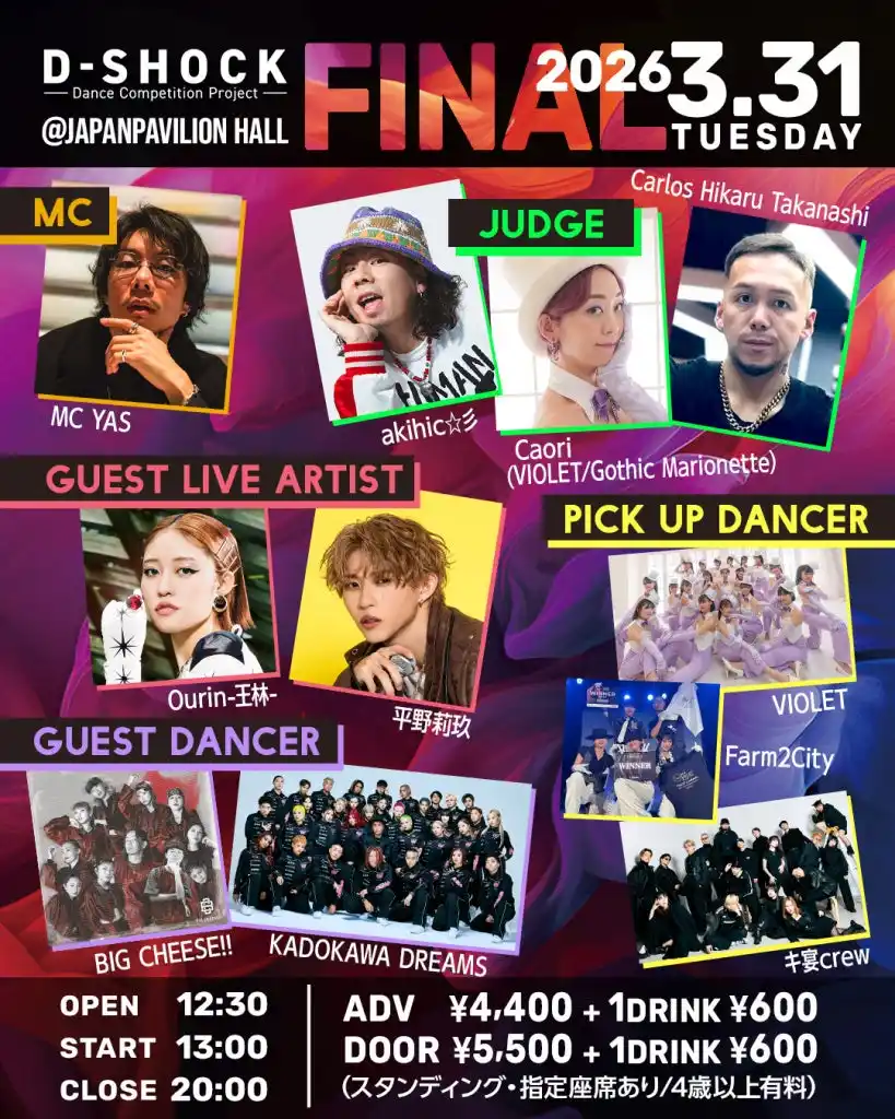 | 全国の予選を勝ち抜いたダンサーたちは、2026年3月31日(火)にJAPAN PAVILION HALL A(埼玉県所沢市)で開催される「D-SHOCK 2025-2026 FINAL」に出場します。 | ||||||||||||||||||