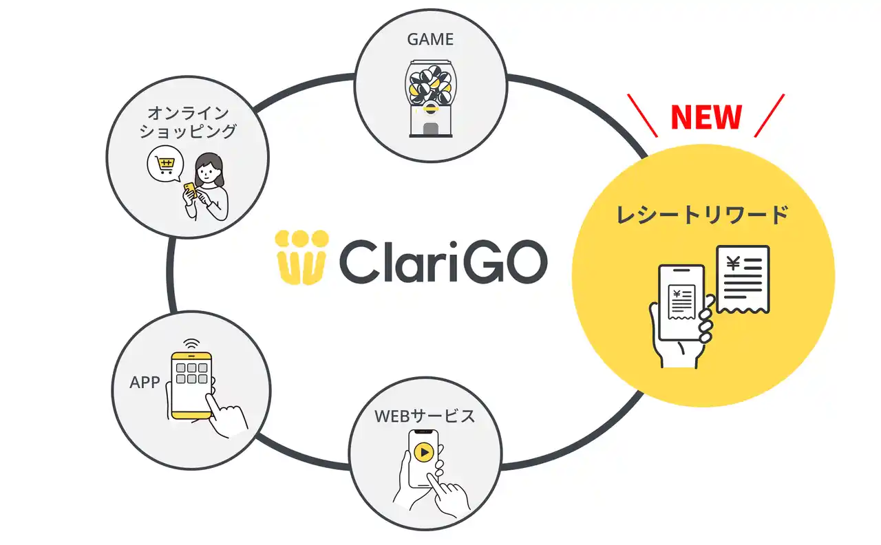 | 『レシ得』は、EDOCODEが提供するポイントモールプラットフォーム『ClariGO』の拡張サービスとして提供されています。『ClariGO』は、オンライン行動データに加え、レシートを通じたオフライン購買データを活用することで、より精度の高い分析や1to1コミュニケーションを可能にします。 | |||