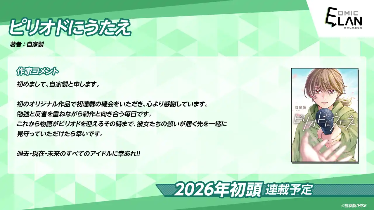 株式会社HIKE(本社:東京都新宿区、代表:三上 政高、以下「HIKE」)の電子漫画出版事業を担う「HIKE編集部」は、少年/青年向け作品を中心に扱うレーベル「COMIC ELAN」(コミックエラン)の第一弾となる4作品を連載開始予定です。本日からそれらの作品概要を4日連続で公開いたします。初回は、アイドルと音楽にまつわる漫画『ピリオドにうたえ』です。正式な配信開始日、配信プラットフォームは後日発表をお待ちください。 |