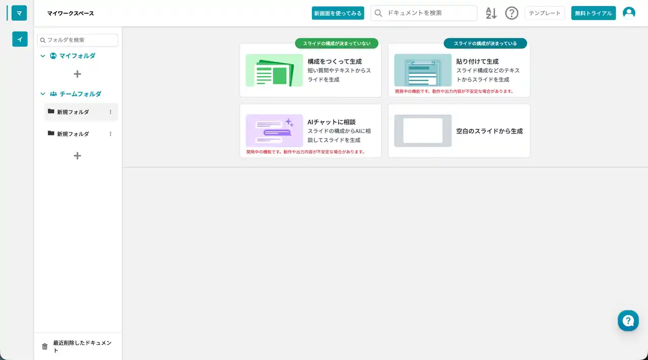 ・最初の迷いが減り、作成開始までが速くなる ・目的に合う生成方法を選びやすく、失敗(選び間違い)が減る ・テンプレート派/AI生成派/白紙派のどのユーザーでも、最短導線で作業を始められる ・既存資料の検索・再編集がしやすくなり、再利用が進む |
