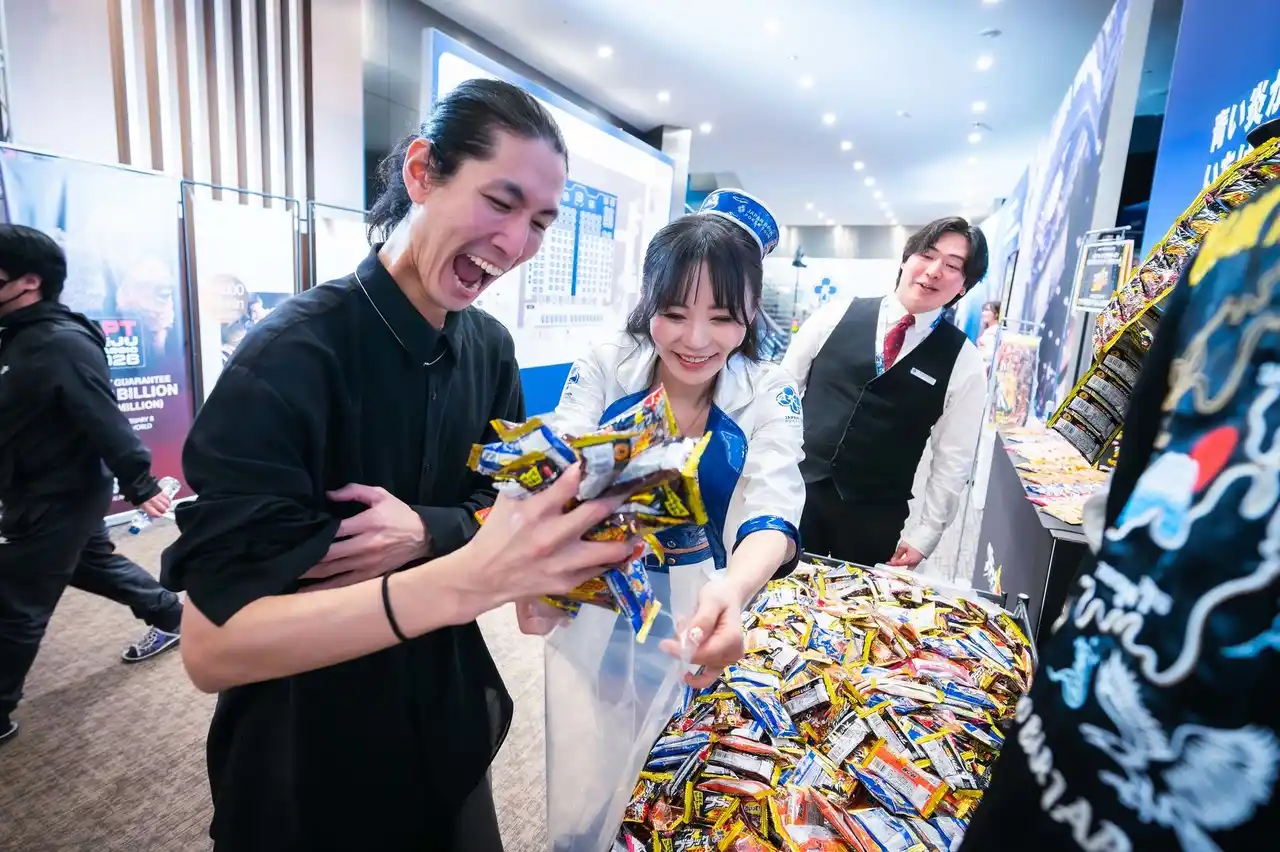 そして、JOPT 2026 Tokyo #01 の期間中には、ブラックサンダーの掴み取りチャレンジが行われました。プレイの合間に立ち寄ることができるこの企画は、多くのプレイヤーの注目を集め、会場に賑わいをもたらしました。 |
