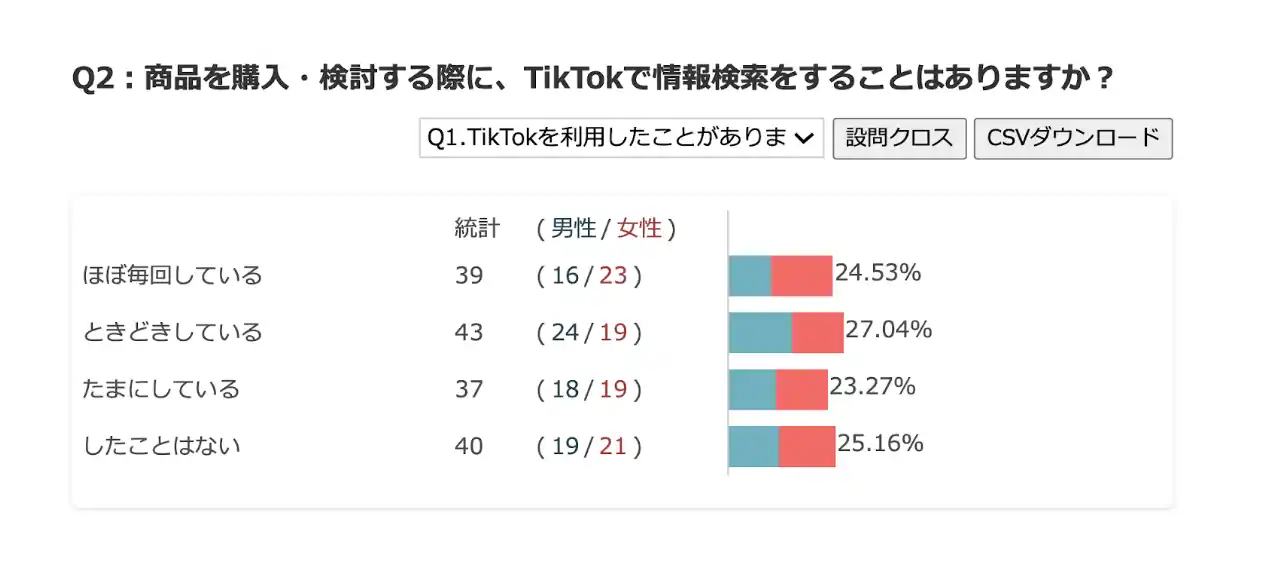 今回の調査から、TikTokは若年層の間で検索行動の起点としての役割を、着実に強めていることが明らかになりました。利用者の半数以上がTikTokを使う中、商品購入時に検索を行う人も多く、動画ならではの“リアルで効率的な情報収集”が購買行動を後押ししています。 |