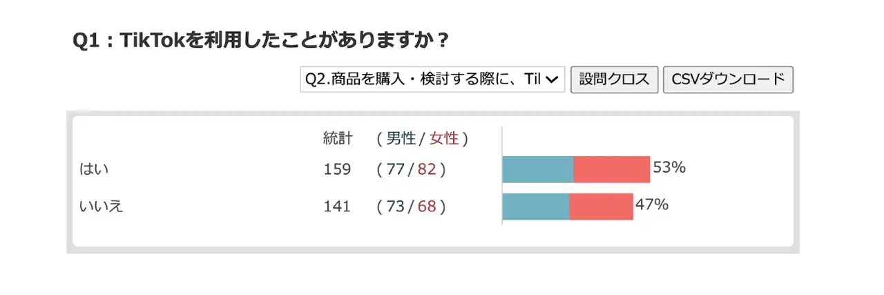TikTok の利用経験を尋ねたところ、全体の 53% が「利用したことがある」と回答し、男女ともほぼ同数(男性77名/女性82名)が利用していることが分かりました。一方、「利用したことがない」と答えた層も47%存在しており、利用率は高いものの、まだ拡大の余地を持つプラットフォームであるといえます。(図1) |