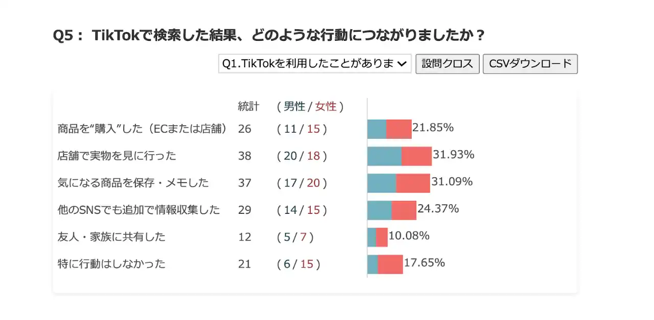 TikTokで検索した後の行動としては、「店舗で実物を見に行った」(31.93%)という回答が最も多く、続いて「気になる商品を保存・メモした」(31.09%)という声が多く見られました。また、26名が「商品を実際に購入した」(21.85%)と回答しており、TikTokでの検索体験が購買行動に直接結びつく例も少なくありません。 |