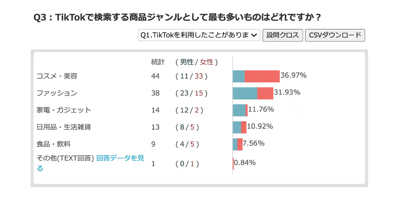 TikTokで検索される商品ジャンルとして最も多かったのはコスメ・美容で、44名(男性11名/女性33名)となりました。ファッションも38名(男性23名/女性15名)と続き、外見に関わるカテゴリーが検索の中心となっています。こうしたジャンルは従来、店頭で比較されることが多かった領域ですが、動画で質感や使用感を把握できる点や、人目を気にせず検索できる利便性が支持されていると考えられます。 |