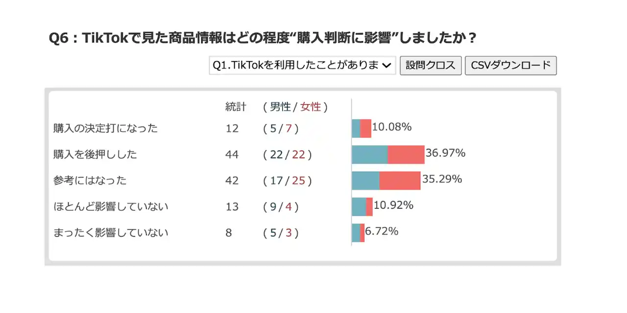 TikTokで見た商品情報が購入判断にどの程度影響したかを尋ねたところ、最も多かったの「購入を後押しした」(36.97%)という回答で、44名が該当しました。 |