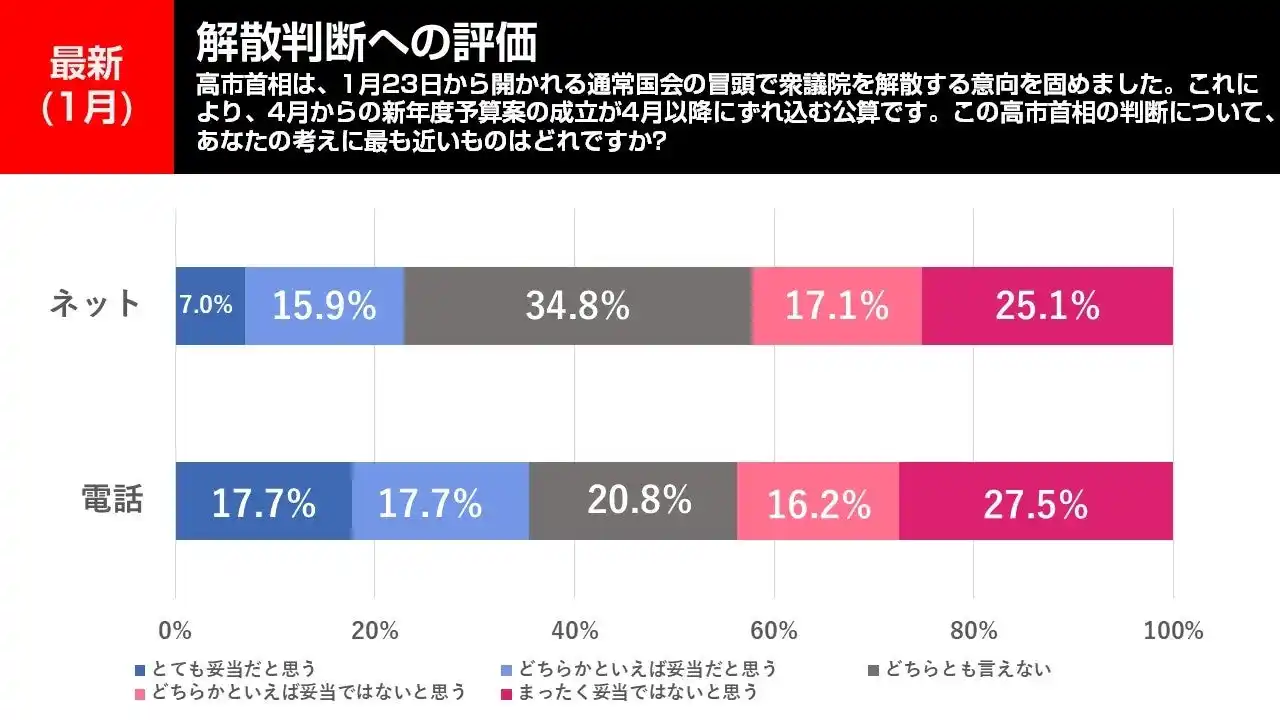今回の調査は高市総理による解散の正式表明(19日)の前でしたが、電話調査とネット調査ともに「妥当ではない(まったく妥当ではない、どちらかといえば妥当ではない)」が「妥当(とても妥当だと思う、どちらかといえば妥当だと思う)」を上回りました。 |