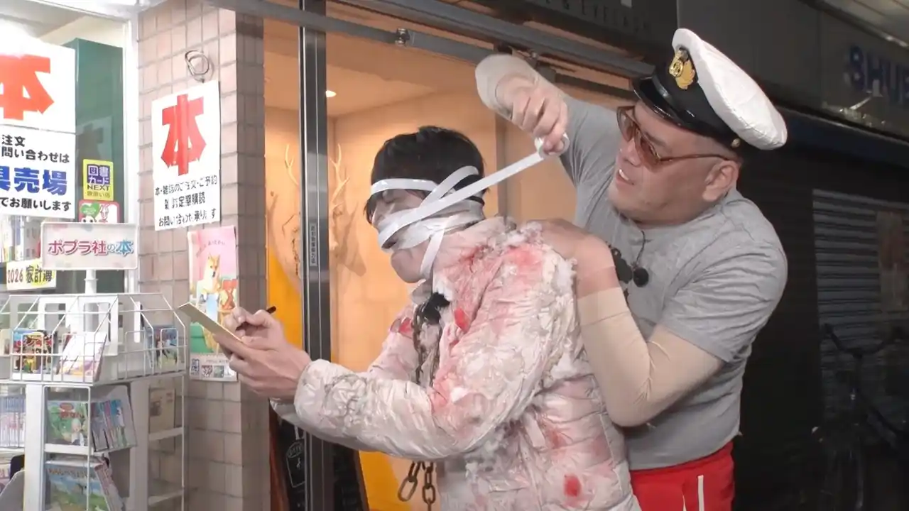 その後も商店街を巡りながら、くっきー!がビニールテープで“純ゾンビ”の顔面をぐるぐる巻きにしたり、テープを巻かれながら身動きが取れない“純ゾンビ”に川北が「今の気持ちで一句お願いします」と川柳を振ったり、純を救おうとあらゆる手段を試します。 |