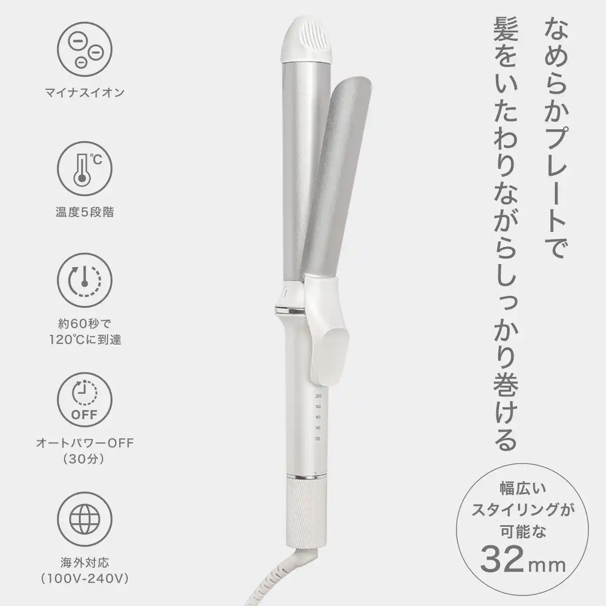 約60秒で使用可能な温度に達する時短設計。幅広いスタイリングが可能な太さ32mm、温度5段階設定、海外対応など、毎日の使いやすさにもこだわった1台です。 |
