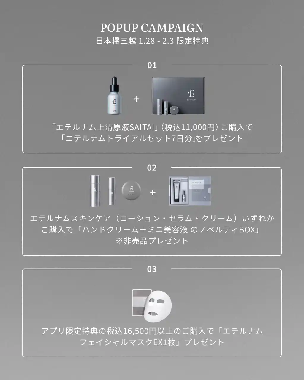 3. 税込16,500円以上のご購入で「エテルナムフェイシャルマスクEX1枚」をプレゼント |
