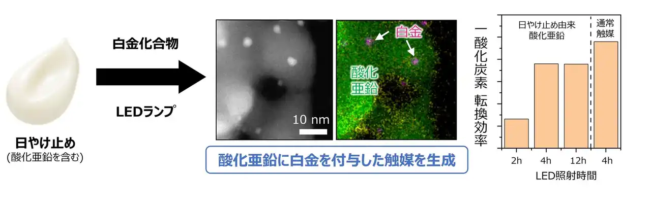 本研究の成果の一例として、酸化亜鉛を触媒化する基礎技術を開発しました。酸化亜鉛を含む日やけ止めに触媒の材料となる白金化合物を加え、LED光を照射することで、日やけ止め中の酸化亜鉛を触媒化することに成功しました。この触媒は通常の方法で生成した触媒と比べても遜色ないレベルで有害ガスである一酸化炭素を分解できることを確認しました(図3)。 |