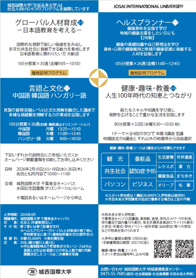 城西国際大学「市民未来大学」は、一般市民向け教育プログラムです。前身となる「シニア・ウェルネス大学」が城西国際大学創立15周年を記念して開設されて以降、教養・健康・学術的取り組みなど大学が有する知的資源を分かりやすく提供することによって、地域住民の方に自ら健康を培い、生きがいをもって社会参加していただくことを目的としています。 |
