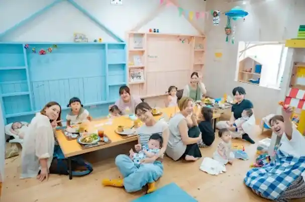 Sunnyday工務店の1階イベントスペースには親子カフェが併設されており、子ども連れでも安心して過ごせる空間として地域に親しまれています。この取り組みは、「家づくりを通して、子育て世代が暮らしやすいまちをつくりたい」という想いから生まれました。 |
