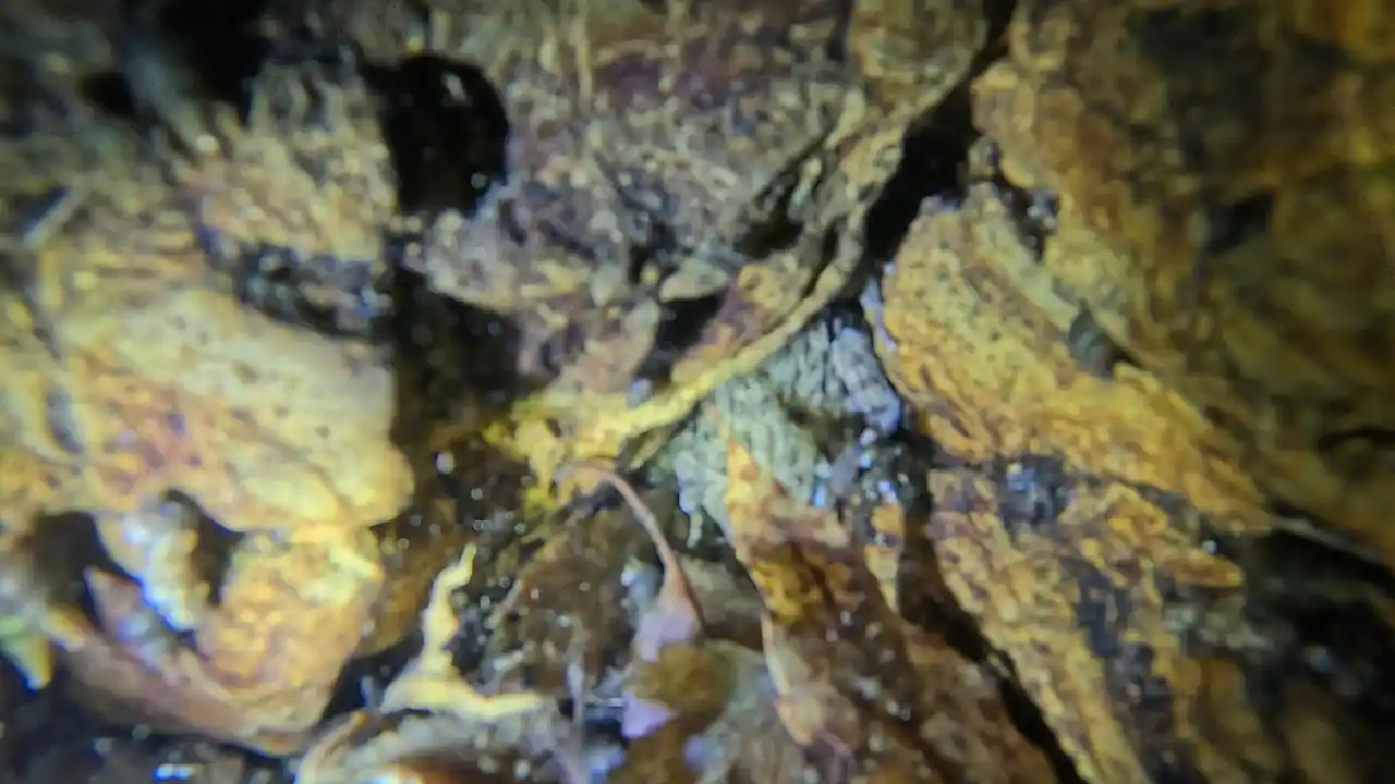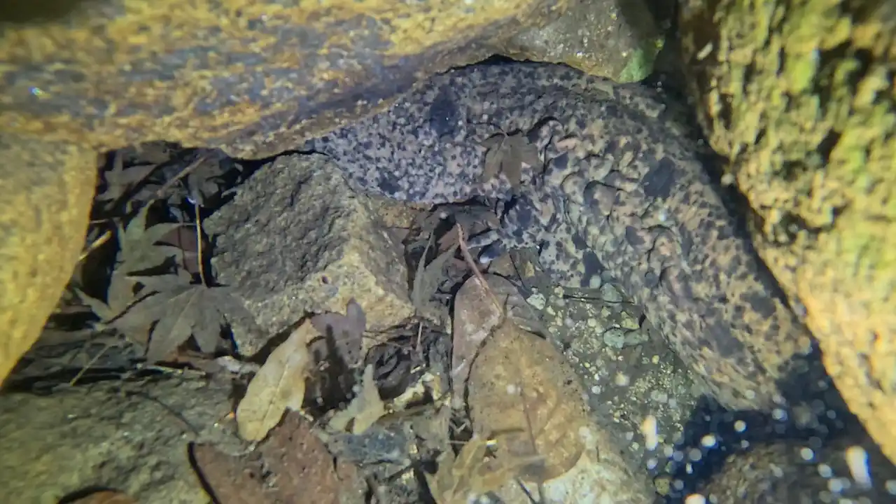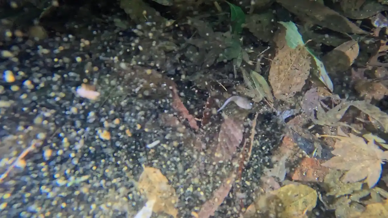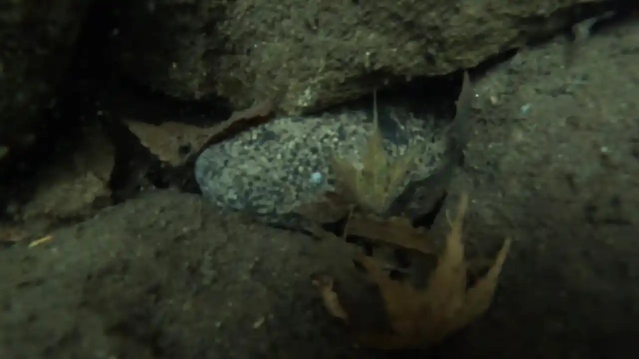 | 越冬中のツチガエルの映像も撮影に成功。滝壺の水深4m地点での確認は、通常確認される浅瀬とは異なるため、珍しい事例と考えられます。 | |||