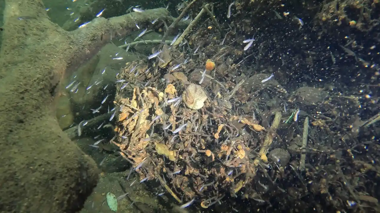 | 潜水調査の結果、冬期の滝壺内部は外気温に比べて2.2℃から2℃と水温変化が緩やかで、安定した環境であることが確認されました。また、岩の隙間や水流の影響を受けにくい場所には生物が身を潜められる空間が多く形成されており、渓谷が一年を通して生命を支える環境であることが映像としても記録されております。 | |||