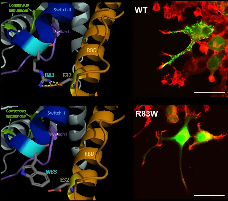 AlphaFold3*9による構造モデル解析では、野生型*10 Rab3AのArg83は RIM1 のGlu32と静電的相互作用を介して結合しており、この相互作用がR83W変異で破綻することが示唆されました(図3左)。 |