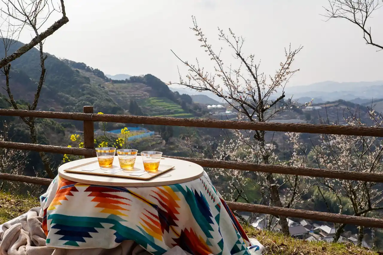 ▲梅の花と絶景をつまみに梅酒をたのしむ「梅酒テラス」 |