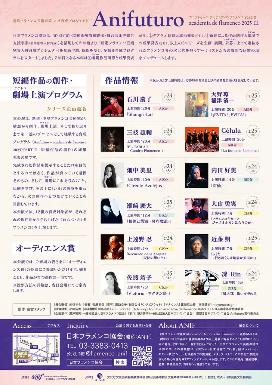 一般社団法人日本フラメンコ協会(東京都中野区、理事長:鍵田真由美)は、2026年2月24日(火)・25日(水)の2日間、大田区民プラザにて、新進フラメンコ芸術家育成プロジェクトの成果発表公演『Anifuturo - academia de flamenco 2025 III』を開催いたします。 |