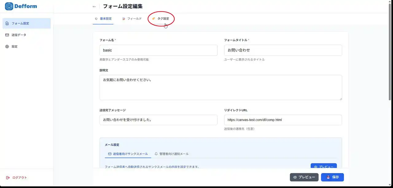 2.「フォーム設定編集」の画面から「タグ編集」画面へ移ります。 |