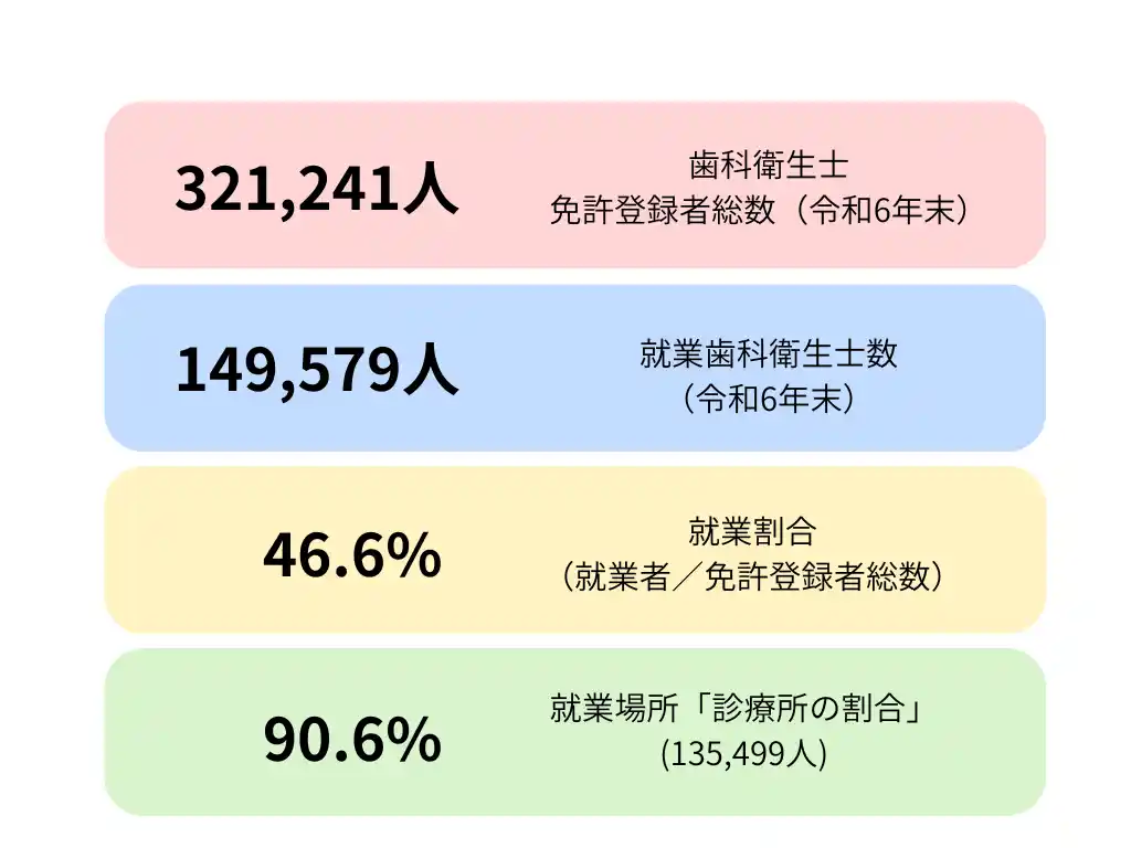 【歯科業界の現状】 厚生労働省の「令和6年 衛生行政報告例(就業医療関係者)」結果として、日本歯科衛生士会は、令和6年末の就業歯科衛生士数が149,579人(約15万人)であると公表しています(前回・令和4年末145,183人から4,396人増)。また就業場所別では、診療所が135,499人(90.6%)と大半を占めています。 |
