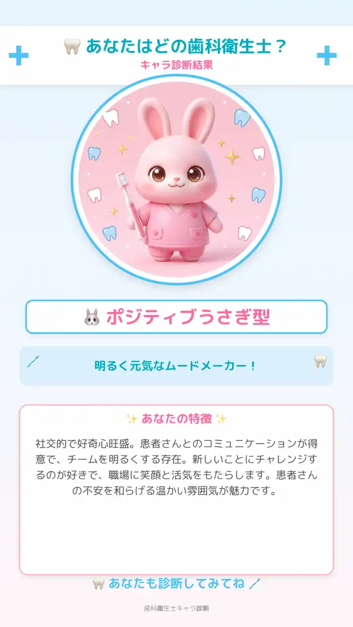 【歯科衛生士キャラ診断メーカー】 「歯科衛生士キャラ診断メーカー」は、質問に回答することで“自分のタイプ”を可愛い動物キャラクターとして表現しながら、働き方の価値観や得意領域、心地よい環境の特徴を整理できる無料診断ツールです。立場(学生/離職中など)に応じて取り組める設計です。 |