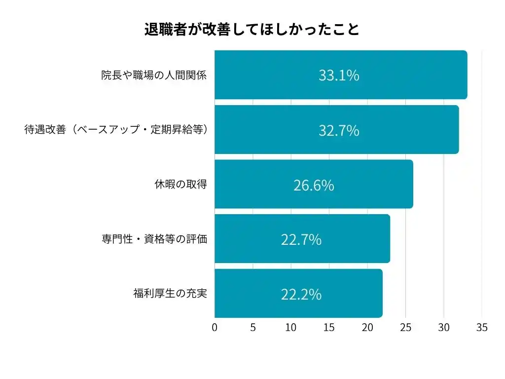 出典:公益社団法人 日本歯科衛生士会「就業者数(厚労省調べ)」 https://www.jdha.or.jp/aboutdh/shugyo.html 一方で、公益社団法人日本歯科衛生士会「歯科衛生士の勤務実態調査 報告書(令和7年3月)」では、退職者が「最後に勤務していた職場で改善してほしかったこと(複数回答)」として、 |