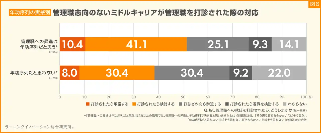 6.今の職場が「年功序列だと思う」ミドルキャリアは、管理職を打診されたら「承諾」「検討」の割合高い |