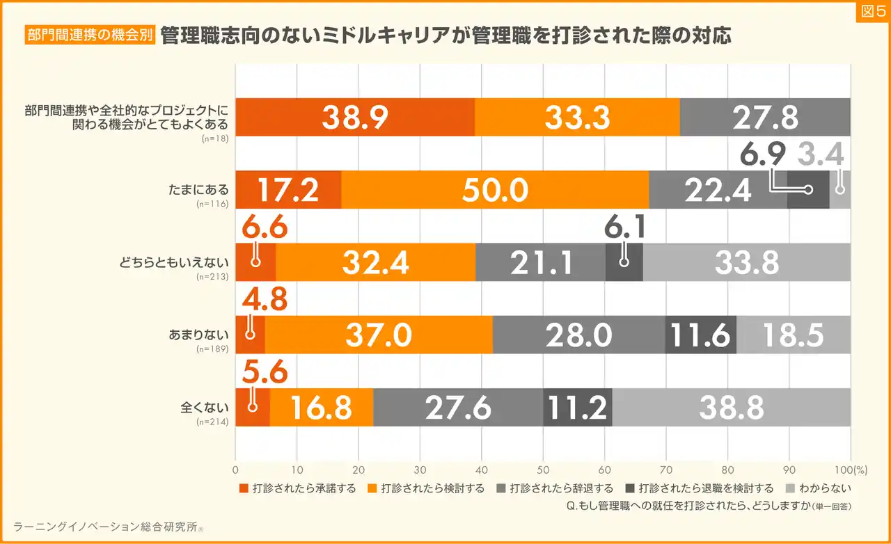 さらに部門間連携や全社的なプロジェクトに関わる機会と管理職を打診された際の対応の関係性を分析しました。 |