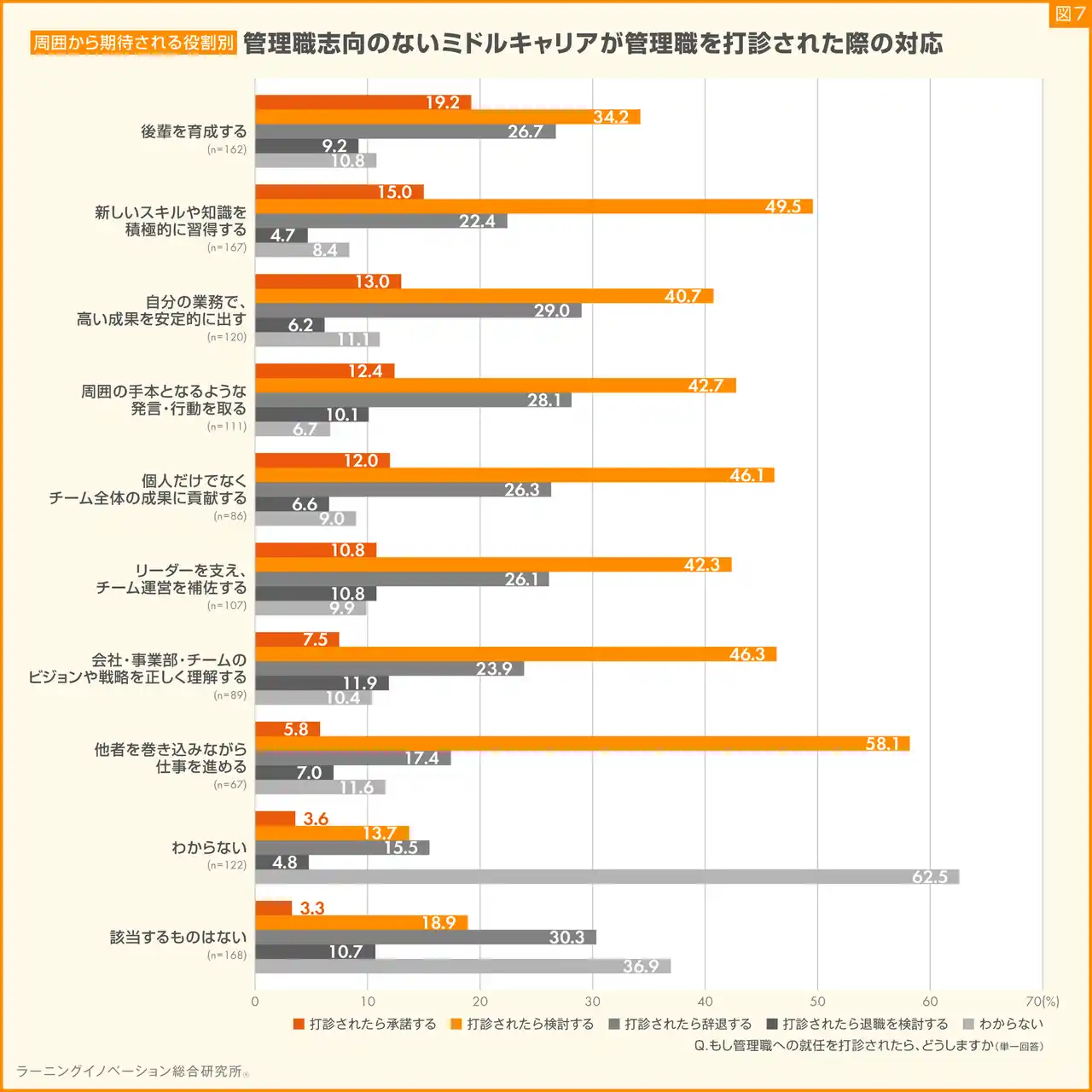 一方、自身の役割について「わからない」「該当するものはない」と回答したミドルキャリアは、管理職就任を打診された際の対応について「わからない」と回答する割合が高く、それぞれ62.5%、36.9%でした(図7)。 |