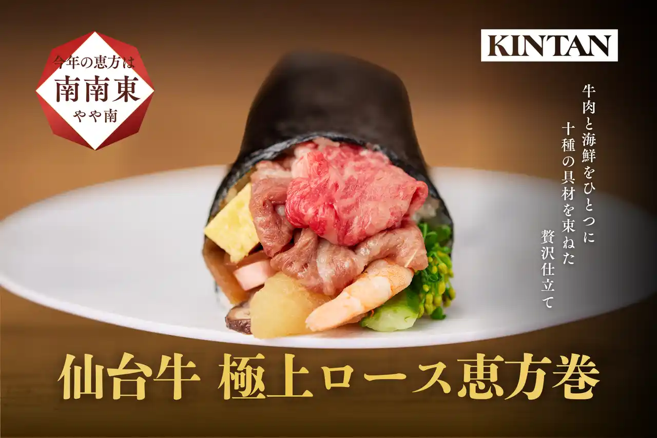あわせて、毎年多くのお客様から支持を集める定番商品「仙台牛 極上ロース恵方巻」も展開。2026年の恵方である「南南東」を向き、願いを込めながら味わう節分のひとときを、KINTANが提案する二つの恵方巻きと共にお過ごしいただけます。 |