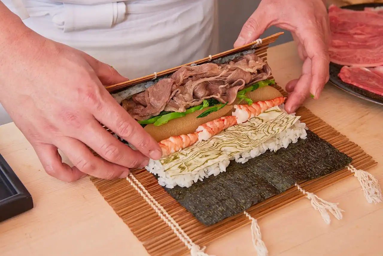 本商品では、その仙台牛の肩ロースを使用。1枚ずつさっと火を入れ、特製のすき焼きだれに絡めることで、肉の旨味を引き出しました。寿司職人と肉職人の発想を掛け合わせ、牛肉を主役に、相性の良い海鮮を厳選。かずのこの食感や北海道産・雪の磯昆布の旨味を添え、恵方巻き全体の味わいに奥行きを持たせています。 |
